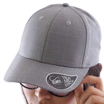 • A grey cap with a mid visor featuring a logo and text. The cap has a textured fabric design.