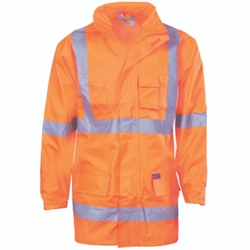 200D polyester/PVC. Seam-sealed, waterproof outer shell, mesh lined, concealed hood. Clear id, phone and pen pockets. Hidden zip access to 3994 reversible vest (as shown above) converts into “6 in 1” 3999 jacket . Cross back generic reflective tape. Embroidery access. NSW Rail Compliant (Orange ONLY)