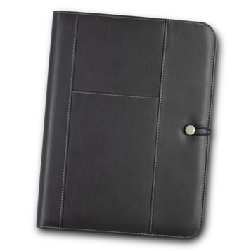 Large luxury PU portfolio with a calculator, a lined A4 pad, a pen loop, pockets for business cards and a secure closure strap. It laser engraves to a matt brown finish.
